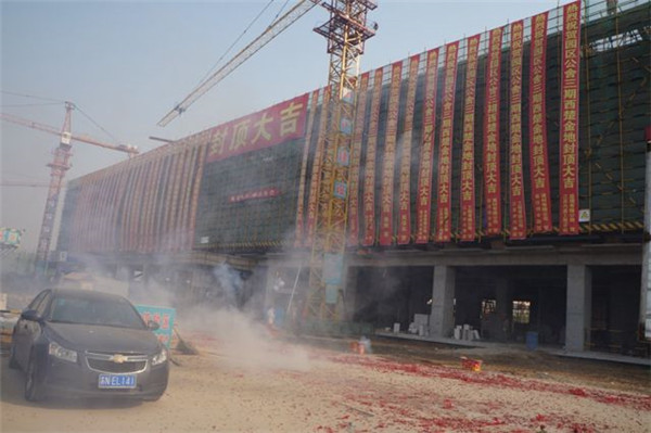11月20日上午9:58,在隆隆的鞭炮聲中,園區(qū)公舍三期西楚金地項目主體工程順利封頂。