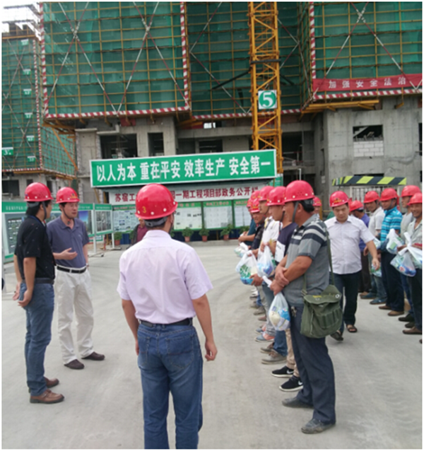 8月11日上午,為切實(shí)做好建筑工地防暑降溫工作,讓員工在健康、清涼的工作環(huán)境下安全作業(yè),園區(qū)黨工委委員、規(guī)劃建設(shè)局局長(zhǎng)周原、副局長(zhǎng)鮑淮斌在開(kāi)發(fā)公司部門負(fù)責(zé)人的陪同下慰問(wèn)園區(qū)在建項(xiàng)目夢(mèng)家園工地現(xiàn)場(chǎng)一線施工人員。