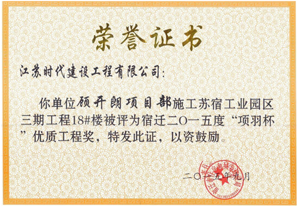 蘇宿園區(qū)白領(lǐng)公寓項(xiàng)目被宿遷市住房和城鄉(xiāng)建設(shè)局授予“項(xiàng)羽杯”優(yōu)質(zhì)工程獎(jiǎng)