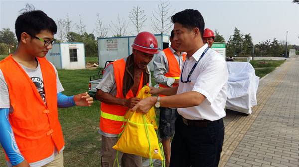 7月28日下午,開發(fā)公司副總裁劉建華帶領(lǐng)公司相關(guān)部門負(fù)責(zé)人來到公司代建項(xiàng)目工地,現(xiàn)場(chǎng)慰問了奮戰(zhàn)在高溫一線的企業(yè)員工和建筑工人,并親自給他們遞上了毛巾、肥皂、清涼油等防暑降溫物品。