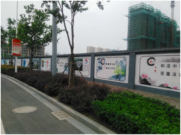 目前,現(xiàn)場(chǎng)各項(xiàng)安全文明設(shè)施正在緊鑼密鼓的建設(shè)中,其中臨時(shí)圍墻不僅是工地對(duì)外展示的第一形象,也是企業(yè)宣傳、安全宣傳、方案公示等信息的展示平臺(tái)。項(xiàng)目部通過(guò)人工手繪結(jié)合局部噴繪的方式既宣傳了創(chuàng)文、創(chuàng)衛(wèi)、核心價(jià)值觀的標(biāo)語(yǔ),又營(yíng)造了“青磚綠瓦”的江南韻味。為園區(qū)的創(chuàng)文建設(shè)增添了新的亮點(diǎn)。