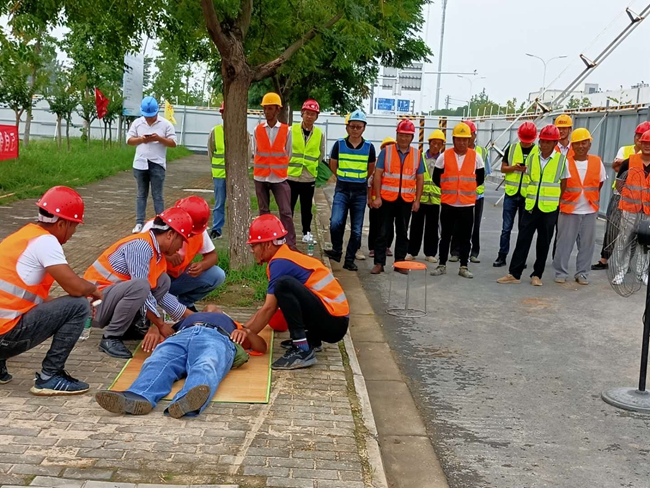 此次演練是模擬工人在戶外作業(yè)時發(fā)生中暑后的現(xiàn)象以及如何進行急救的。演練現(xiàn)場,演練示范人員按照應急預案對“中暑”的員工進行緊急施救,首先發(fā)現(xiàn)中暑人員后將其迅速轉移到陰涼通風的地方,移動、冷敷、擦浴、降溫、補水......各項救援措施緊張有序。整個演練過程歷時30多分鐘,中暑人員在急救小組的緊密合作下,及時得到救治。演練過程中,市政工程部全體人員和各在建工地相關人員全程參與觀摩。