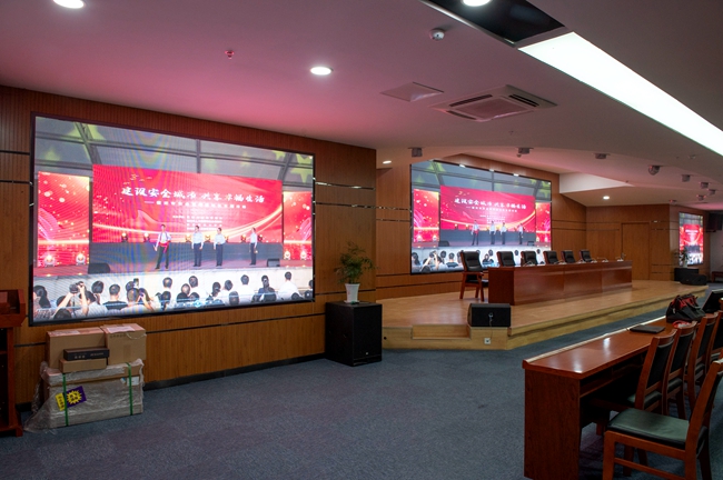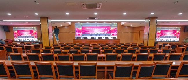 經(jīng)過改造,安全教育館新增3塊LED屏幕,其中主席臺(tái)處主LED顯示屏面積約20平方,東西兩側(cè)輔助LED顯示屏各約6平方。LED屏幕采用顯示單元像素間距為P2-2.5,具有顯示面積大、分辨率高、超高對(duì)比度、超寬視角、無(wú)縫拼接、維護(hù)方便等優(yōu)點(diǎn)。改造后進(jìn)一步提升了視頻會(huì)議效果,增加了會(huì)場(chǎng)多功能性。