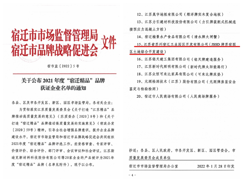 近日,江蘇省蘇州宿遷工業(yè)園區(qū)開發(fā)有限公司(簡稱開發(fā)公司或JSSD)獲得2021年度“宿遷精品”品牌認定。