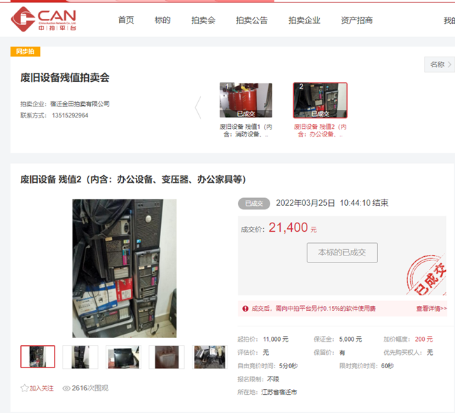 3月25日上午10時(shí)30分,開(kāi)發(fā)公司一批廢舊辦公設(shè)備、辦公家具、變壓器等物資在中拍平臺(tái)公開(kāi)拍賣(mài),7家競(jìng)買(mǎi)人,經(jīng)過(guò)14分10秒緊張激烈競(jìng)價(jià),最終以21400元成交。