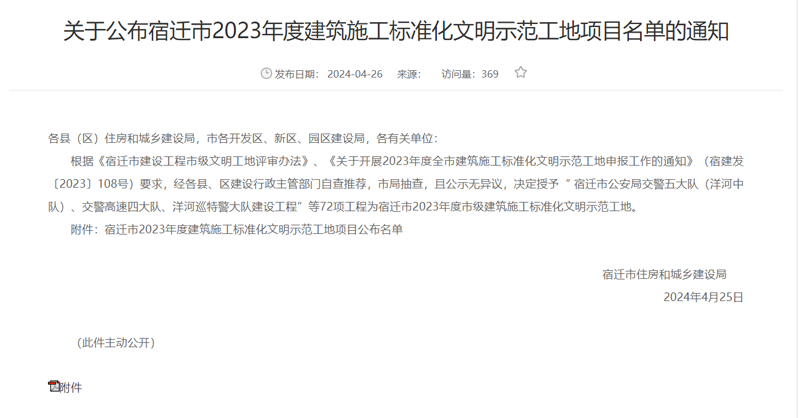 近日,宿遷市2023年度建筑施工標(biāo)準(zhǔn)化文明示范工地項目名單發(fā)布,蘇宿工業(yè)園區(qū)智慧信息產(chǎn)業(yè)園項目榮獲2023年度市級建筑施工標(biāo)準(zhǔn)化文明示范工地榮譽稱號。