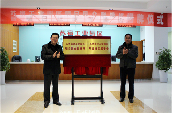 1月6日,宿遷市副市長,蘇宿園區(qū)黨工委書記、管委會主任方文浜與居民代表侍軍共同為明日民眾聯(lián)絡(luò)所和明日社區(qū)居委會揭牌,園區(qū)第二個民眾聯(lián)絡(luò)所正式建成投用,第一個社區(qū)居委會正式成立。