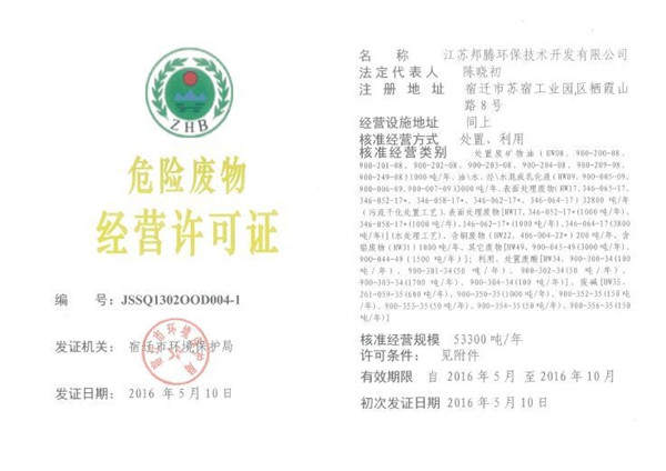 近日,園區(qū)江蘇邦騰環(huán)保技術開發(fā)有限公司獲頒由宿遷市環(huán)保局頒發(fā)的危險廢物經(jīng)營許可證,主要從事利用、處置廢礦物油、廢酸、廢堿、表面處理廢物等,處理量為53300噸/年。